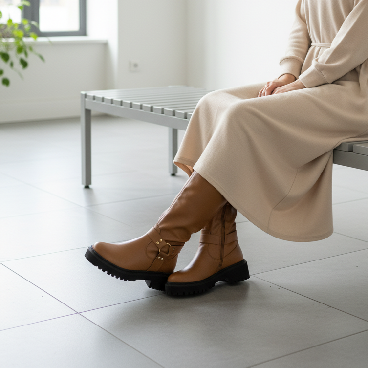 بوت طويل أنيق مصنوع من الجلد الأسود الفاخر، يتميز بتصميم عصري يجمع بين الأناقة والقوة. يمتد البوت إلى ما فوق الركبة، ويحتوي على سحّاب جانبي لسهولة الارتداء، مع كعب متوسط وسميك يمنح ثباتًا وراحة أثناء المشي. يزينه حزام جلدي مزخرف بمسامير معدنية صغيرة تضيف لمسة جريئة وجذابة. مناسب لإطلالات الخريف والشتاء، ويتناغم بشكل رائع مع الجينز أو الفساتين الصوفية.