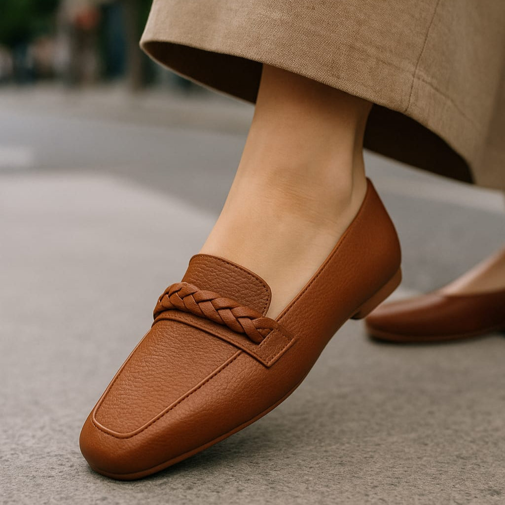 حذاء لوفر أنيق وعصري مصنوع من جلد صناعي عالي الجودة بلون بني غني. يتميز بملمس ناعم يحاكي الجلد الطبيعي، وحزام مضفر على الجزء العلوي لإضفاء لمسة راقية وأنيقة. تصميمه الكلاسيكي ونعله المرن المبطن يوفران راحة طوال اليوم، مما يجعله مثاليًا للعمل والنزهات الكاجوال.